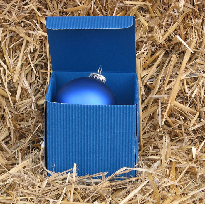 Formschöne Einzelverpackung aus blauer Wellpappe.